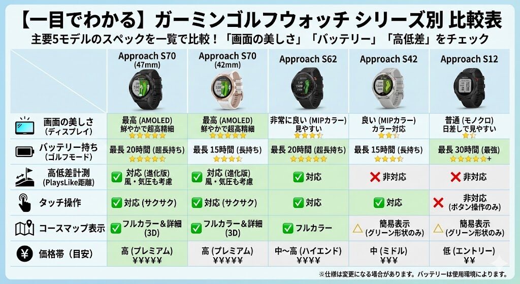 【一目でわかる】ガーミンゴルフウォッチ シリーズ別 比較表