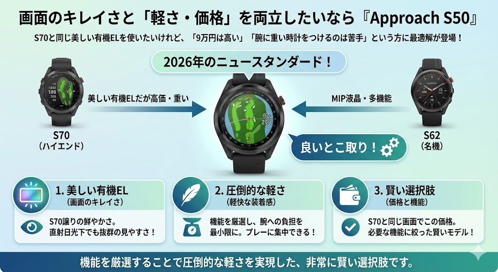 👉 結論: 「ただ距離を知りたい」だけでなく「自分のゴルフを分析して上手くなりたい」なら、この機能が充実している上位モデル(S70/S62/S50)がおすすめです。