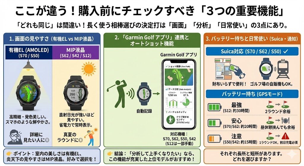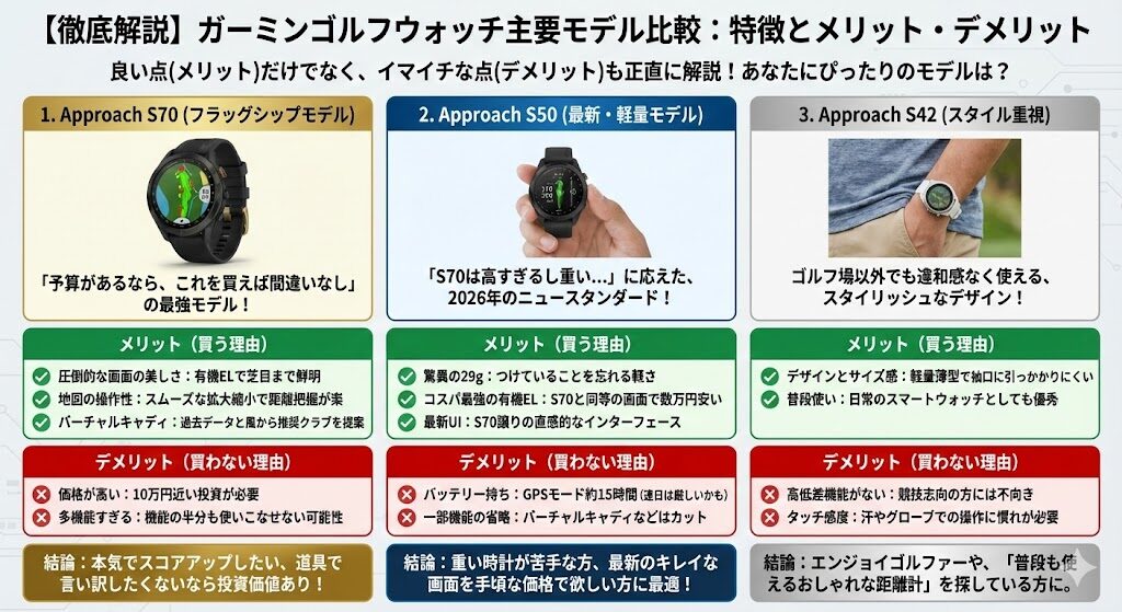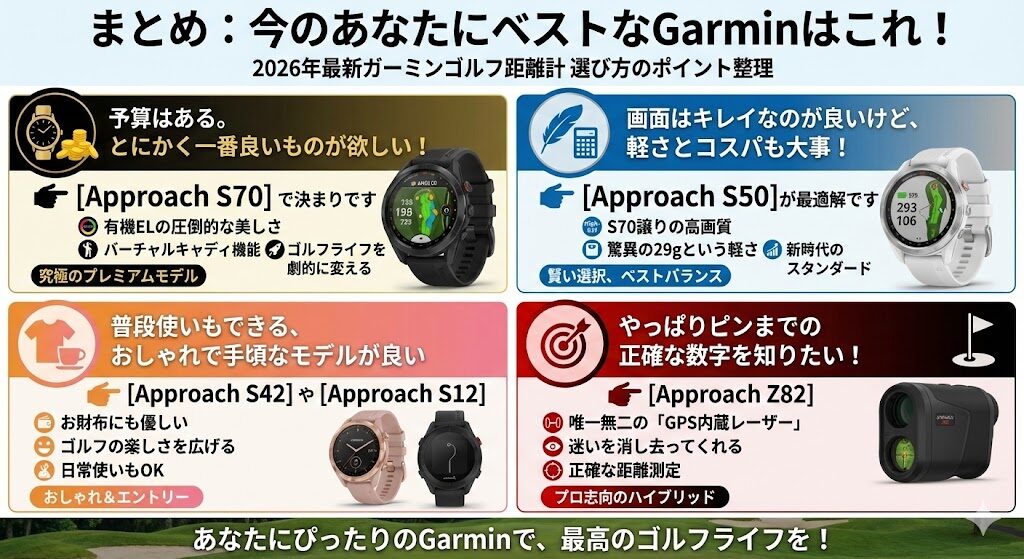 ここまで、2026年最新のガーミンゴルフ距離計を比較してきましたが、