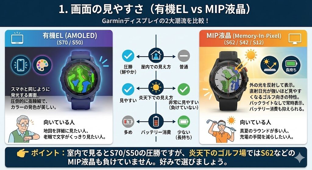 👉 ポイント: 室内で見るとS70/S50の圧勝ですが、炎天下のゴルフ場ではS62などのMIP液晶も負けていません。好みで選びましょう。