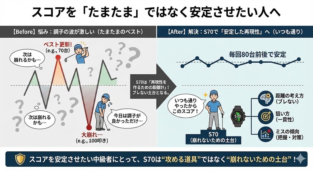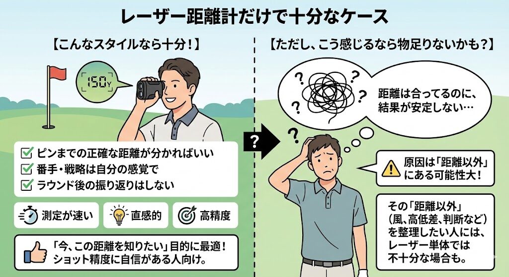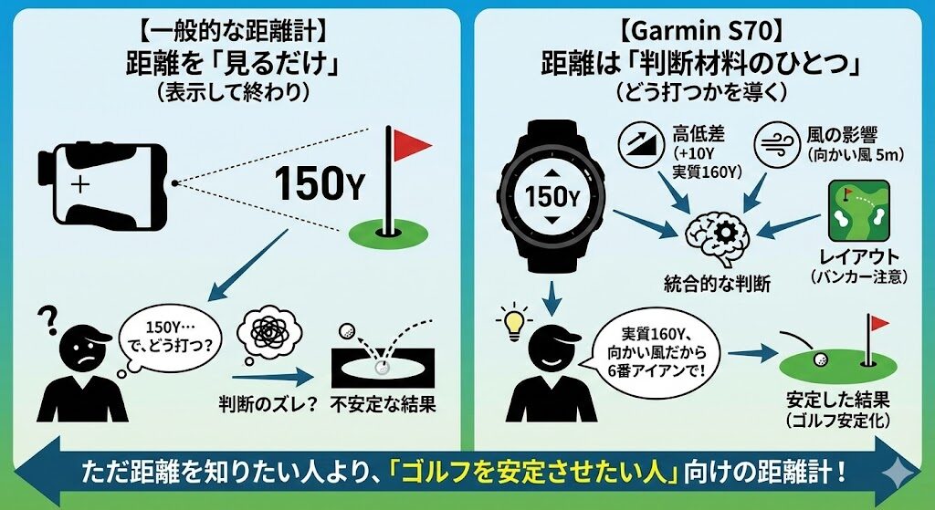 一方で、距離や番手の迷いを減らし、スコアを安定させ、